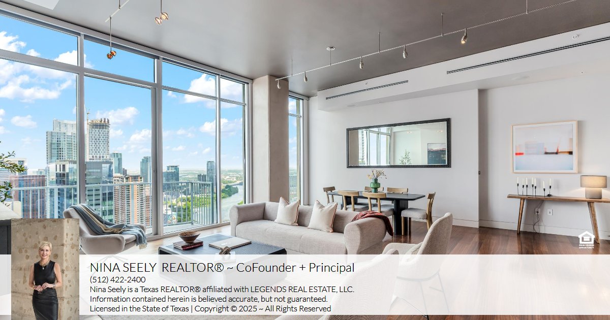 Located on the top floor, this east-facing home spans 2,070 square feet with 12-foot ceilings, floor-to-ceiling windows, and two private balconies offering unobstructed views of Lady Bird Lake, the city skyline, and the Hill Country.